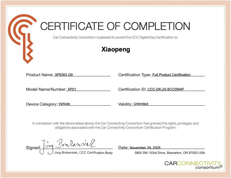 近日,全球车联领域权威组织CCC全球车联联盟(Car Connectivity Consortium)公布2025年度CCC Digital Key认证名单,小鹏汽车旗下的P7+、G6、G9车型的数字钥匙成功通过认证,跻身全球首批获此认证的中国车企行列。
