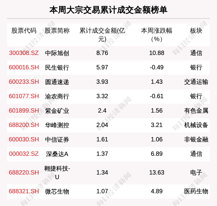 本周大宗交易累计成交金额前3的公司是中际旭创、民生银行、圆通速递,累计成交金额分别为8.76亿元,5.97亿元,3.93亿元。