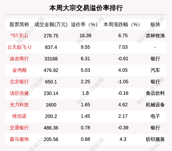 溢价交易方面,本周有1笔大宗交易溢价率超过10%。